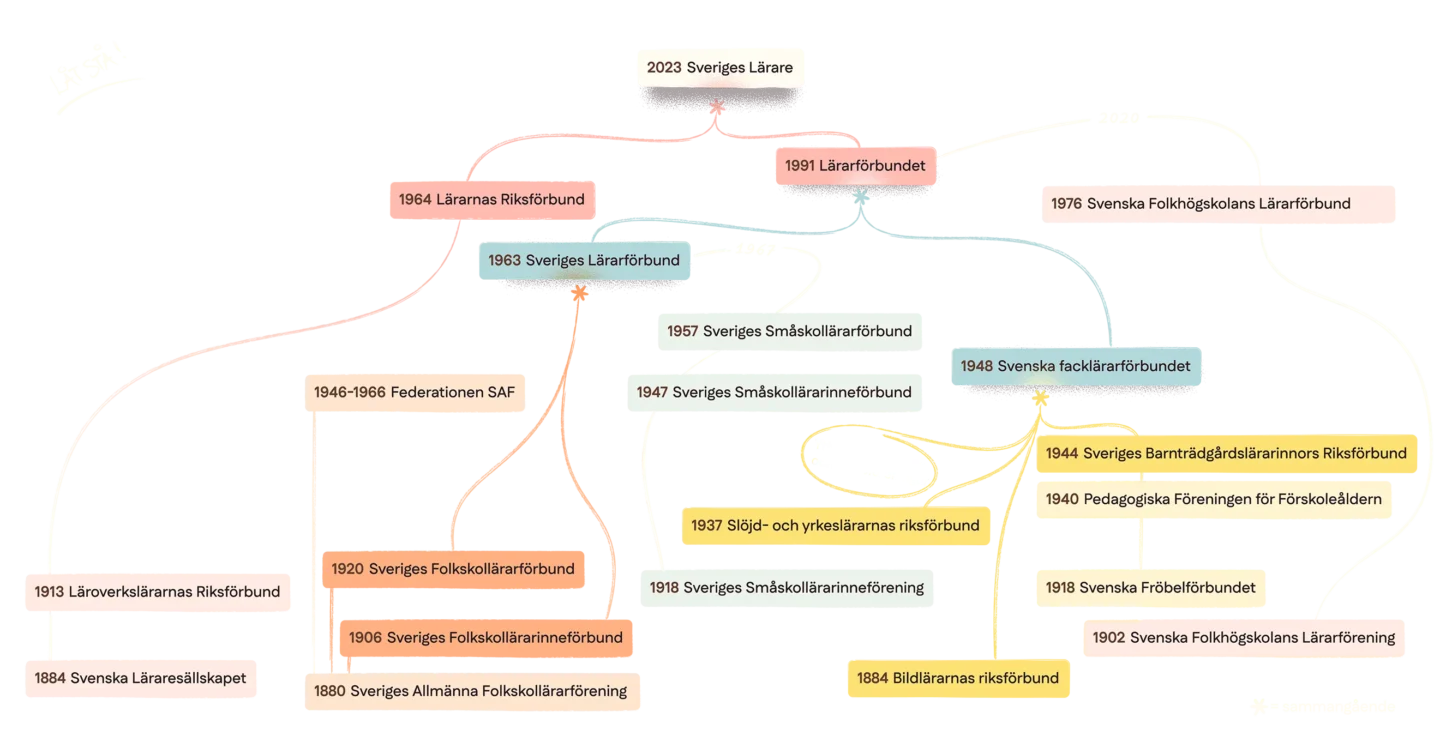 Lärarna organiserade sig till en början utifrån yrkeskategorier och kön, men med tiden gjorde sammanslagningar att den samlade kraften bakom lärarnas röster blev starkare. Idag har vi en enda facklig organisation för alla lärare. Det tog närmare 150 år att nå dit.